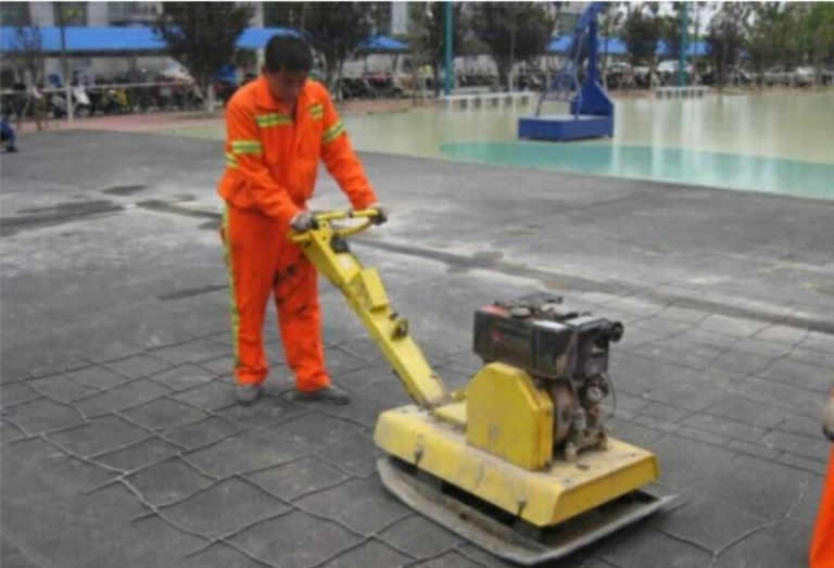 3、利用平板夯将模具压入软化的沥青路面(深度约8mm)。